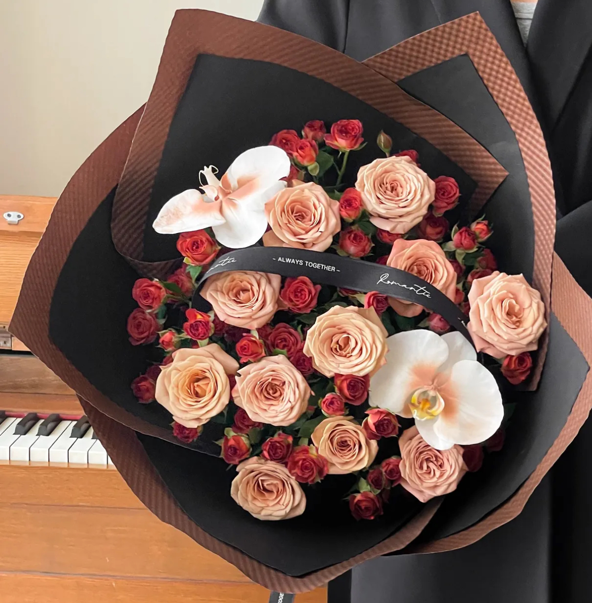 【黑咖情话】美拉德复古风蝴蝶兰11枝卡布奇诺玫瑰五芒星混搭花束